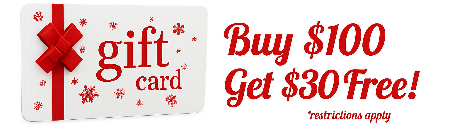 Take advantage of our special holiday gift card offer, for gift cards purchased online only. Get a bonus promo card with the purchase of denominations listed below. Gift card is usable right away, bonus promo card is valid January 1 thru March 31, 2026.